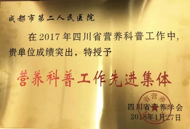 2018年1月27日,四川省营养学会召开2017年度总结暨表彰会,我院荣获四川省“营养科普工作先进集体”称号,营养科副主任李宏宇被评为四川省“营养科普工作先进个人”。