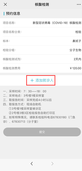 我院可通过微信服务号、互联网医院以及自助设备三种方式申请“核酸检测”。